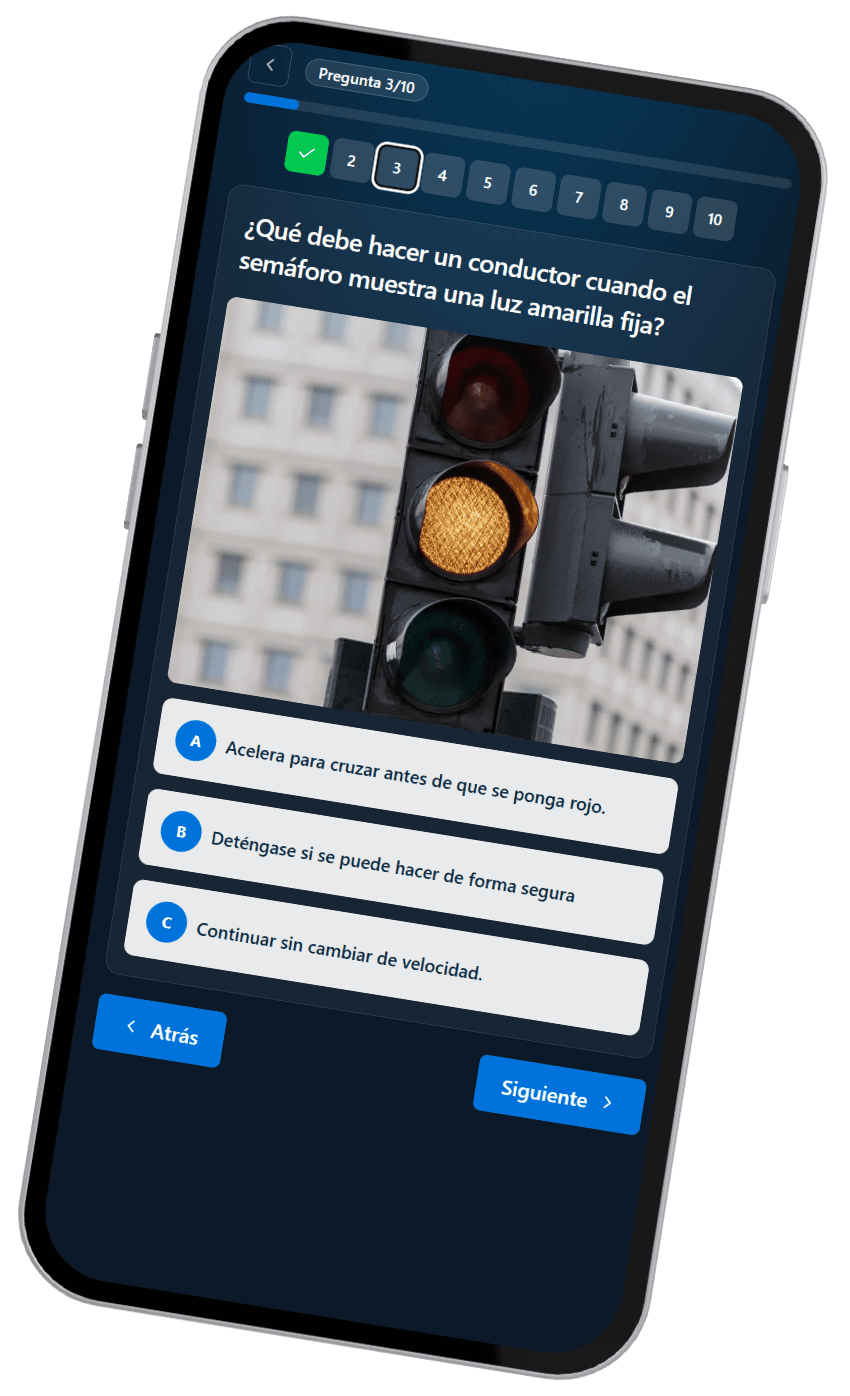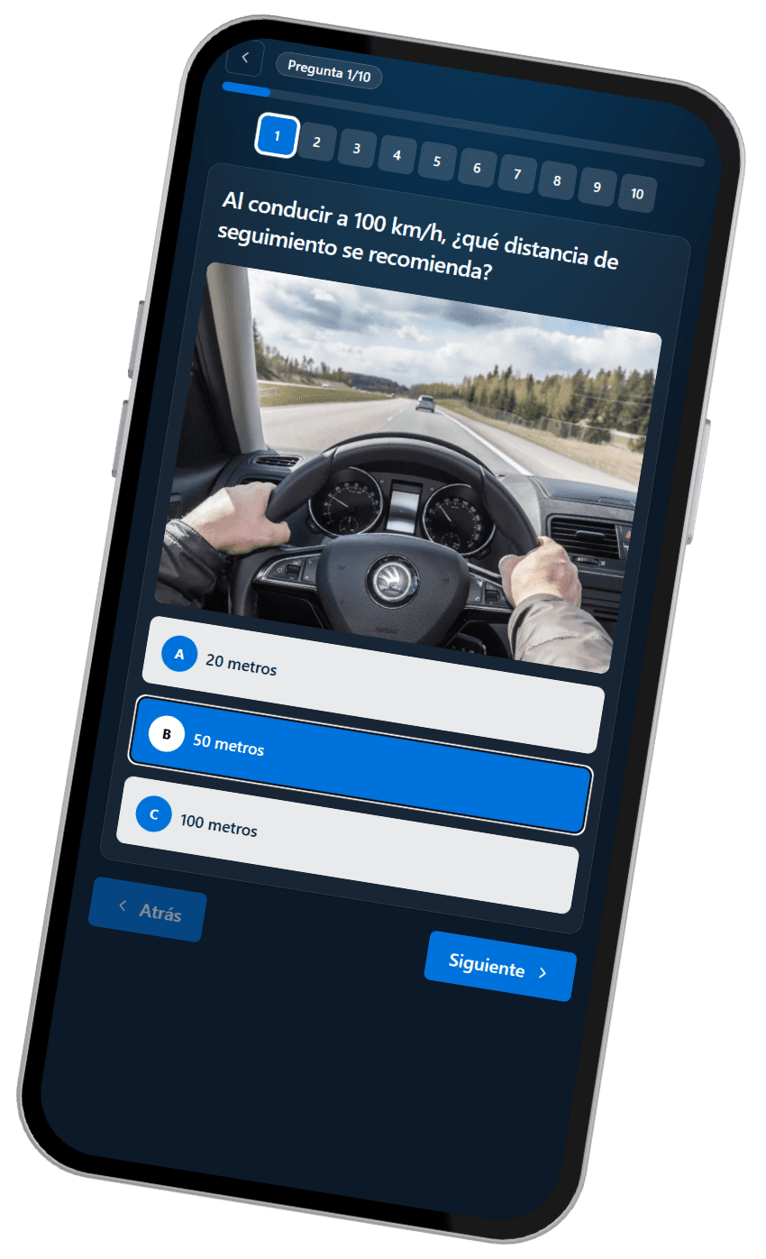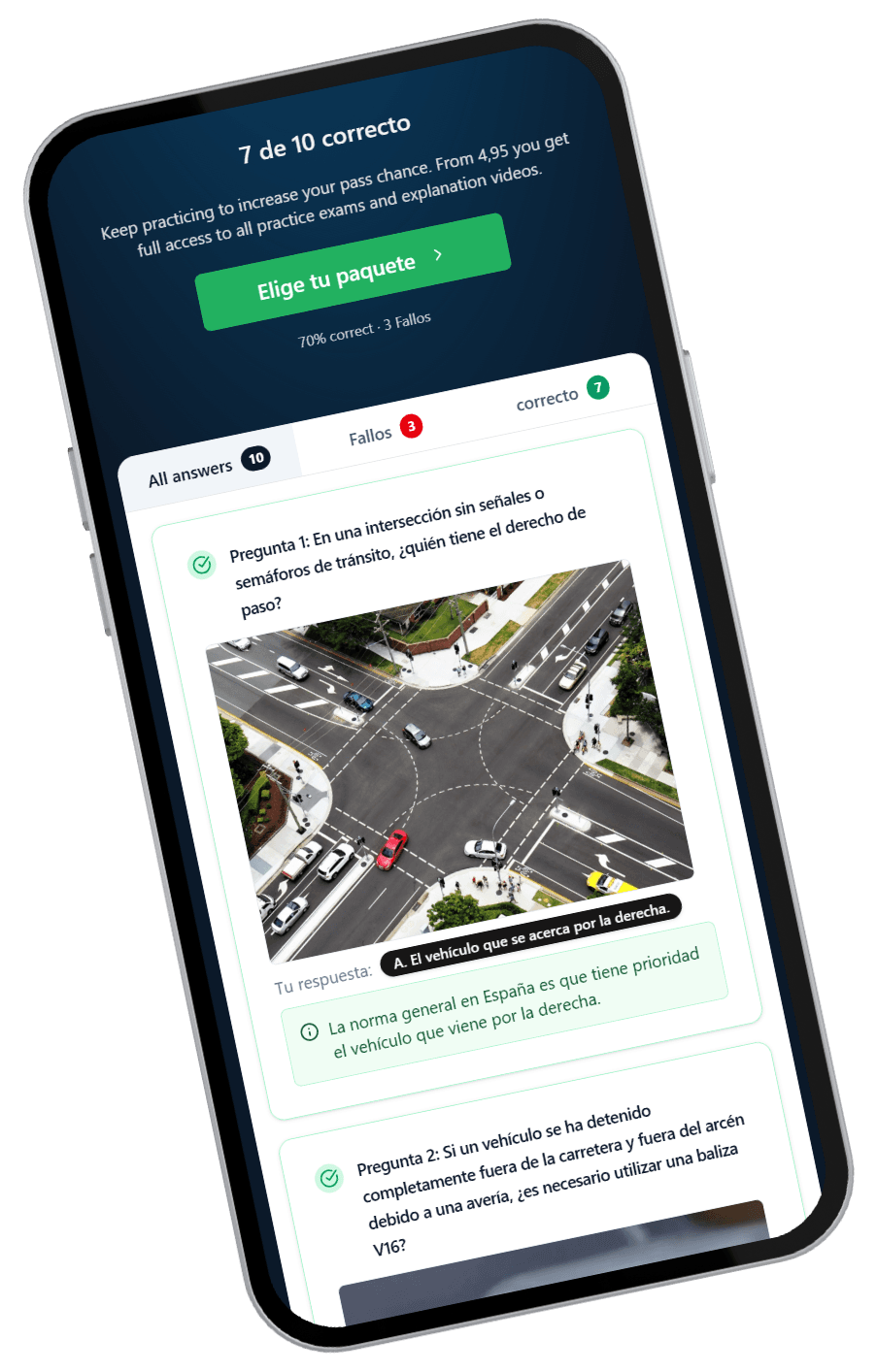 Learn for your car theory exam with our extensive explanation videos and practice exams. In our practice exams you practice with the latest DGT method and animated clips.